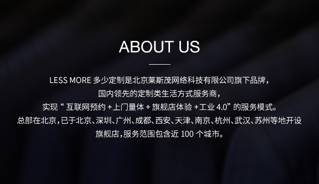 LESS MORE 多少定制是能夠提供男士全品類定制產(chǎn)品的生活方式品牌,對于中國商務(wù)男士來說,定制是對西裝最認真的態(tài)度。